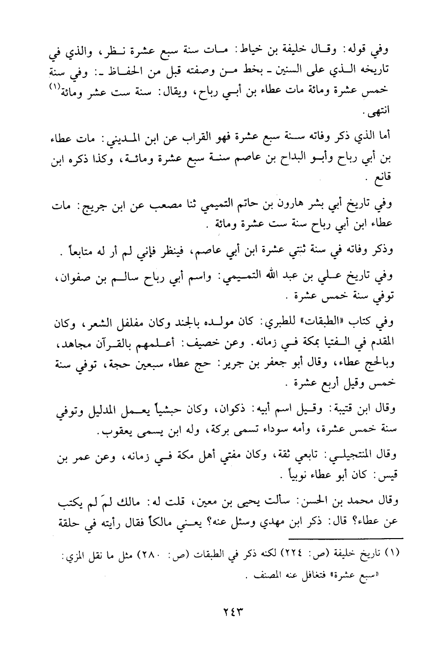 وفي قوله: وقال خليفة بن خياط: مات سنة سبع عشرة نظر، والذي في تاريخه الذي على السنين – بخط من وصفته قبل من الحفاظ -: وفي سنة خمس عشرة ومائة مات عطاء بن أبي رباح، ويقال: سنة ست عشر ومائة، انتهى.