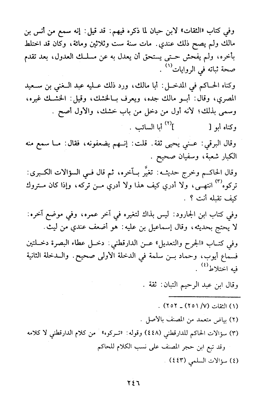 وفي كتاب " الثقات " لابن حبان لما ذكره فيهم: قد قيل: إنه سمع من أنس بن مالك ولم يصح ذلك عندي. مات سنة ست وثلاثين ومائة، وكان قد اختلط بآخره، ولم يفحش حتى يستحق أن يعدل به عن مسلك العدول، بعد تقدم صحة ثباته في الروايات.