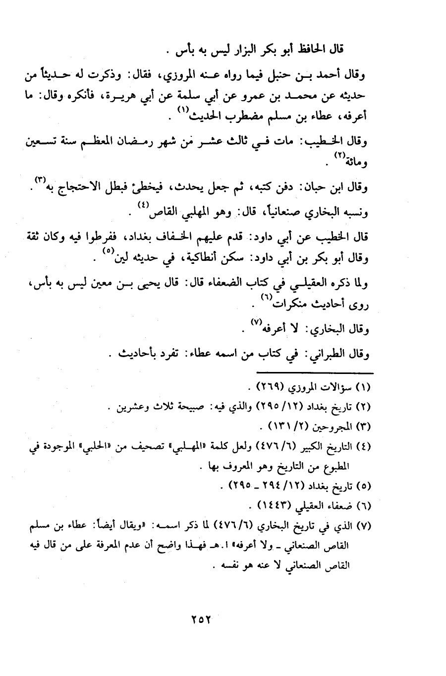 وقال أحمد بن حنبل فيما رواه عنه المروزي، فقال: وذكرت له حديثا من حديثه عن محمد بن عمرو عن أبي سلمة عن أبي هريرة، فأنكره وقال: ما أعرفه، عطاء بن مسلم مضطرب الحديث.