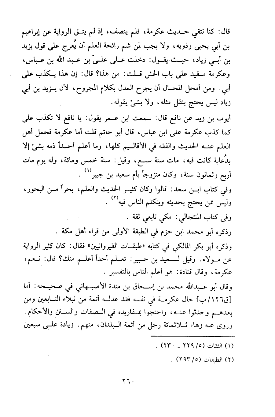 قال: كنا نتقي حديث عكرمة، فلم ينصف، إذ لم يتق الرواية عن إبراهيم بن أبي يحيى وذويه، ولا يجب لمن شم رائحة العلم أن يعرج على قول يزيد بن أبي زياد، حيث يقول: دخلت على علي بن عبد الله بن عباس، وعكرمة مقيد على باب الحش. قلت: من هذا؟ قال: إن هذا يكذب على أبي. ومن أمحل المحال أن يجرح العدل بكلام المجروح؛ لأن يزيد بن أبي زياد ليس يحتج بنقل مثله، ولا بشيء يقوله.