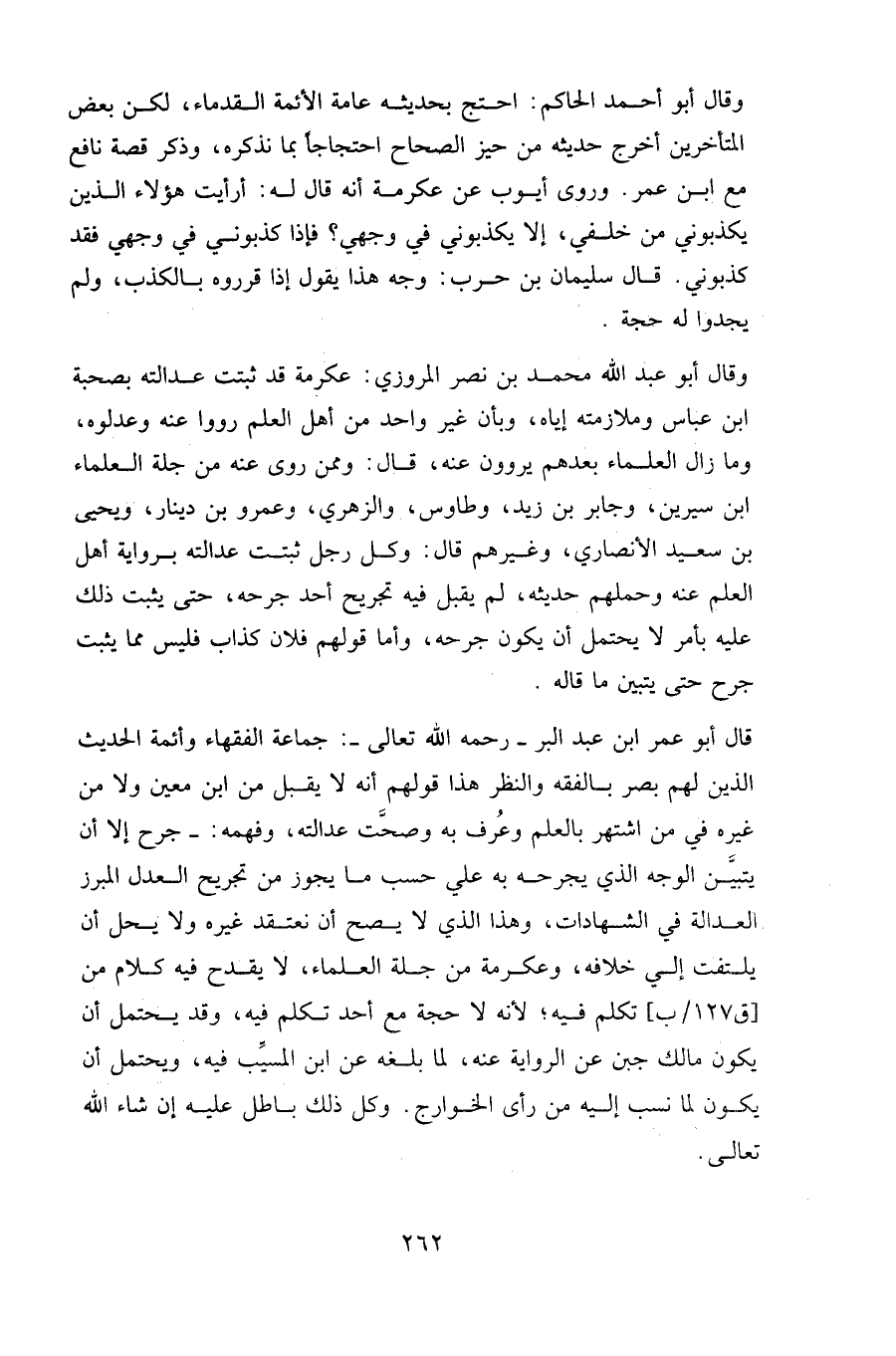 قال أبو عمر بن عبد البر – رحمه الله تعالى -: جماعة الفقهاء وأئمة الحديث الذين لهم بصر بالفقه والنظر، هذا قولهم أنه لا يقبل من ابن معين ولا من غيره في من اشتهر بالعلم وعرف به وصحت عدالته، وفهمه: جرح إلا أن يتبين الوجه الذي يجرحه به على حسب ما يجوز من تجريح العدل المبرز العدالة في الشهادات، وهذا الذي لا يصح أن نعتقد غيره، ولا يحل أن يلتفت إلى خلافه، وعكرمة من جلة العلماء، لا يقدح فيه كلام من [ق ١٢٧ / ب] تكلم فيه؛ لأنه لا حجة مع أحد تكلم فيه، وقد يحتمل أن يكون مالك جبن عن الرواية عنه، لما بلغه عن ابن المسيب فيه، ويحتمل أن يكون لما نسب إليه من رأى الخوارج. وكل ذلك باطل عليه إن شاء الله تعالى