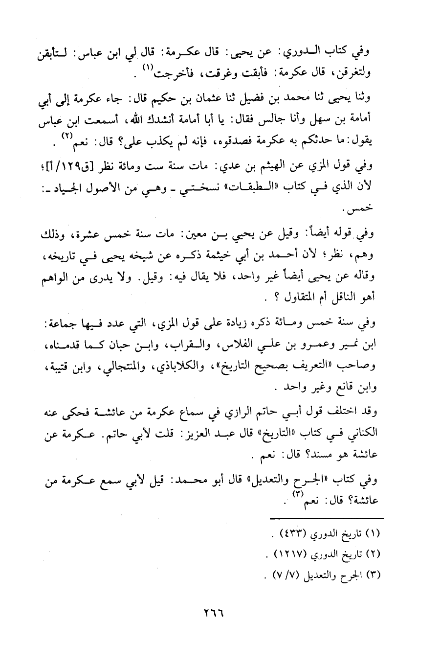 وقد اختلف قول أبي حاتم الرازي في سماع عكرمة من عائشة، فحكى عنه الكناني في كتاب " التاريخ ". قال عبد العزيز: قلت لأبي حاتم. عكرمة عن عائشة هو مسند؟ قال: نعم.