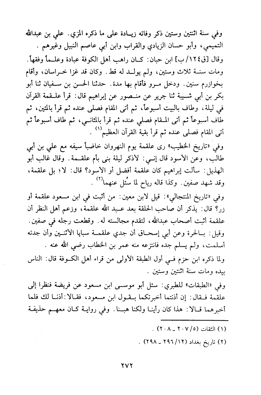وفي " تاريخ المنتجالي ": قيل لابن معين: من أثبت في ابن مسعود علقمة أو زر؟ قال: يذكر أن صاحب الحلقة بعد عبد الله علقمة، وزعم أهل النظر أن علقمة أثبت أصحاب عبد الله، لتقدم مجالسته له. وقطعت رجله في صفين.