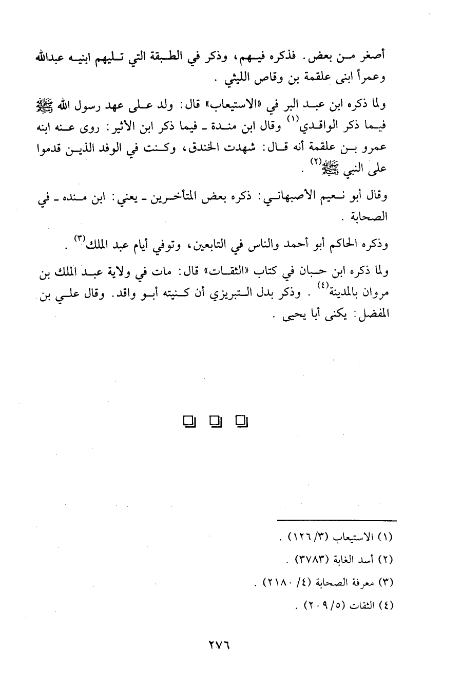 أصغر من بعض. فذكره فيهم، وذكر في الطبقة التي تليهم ابنيه عبد الله وعمرا ابني علقمة بن وقاص الليثي.