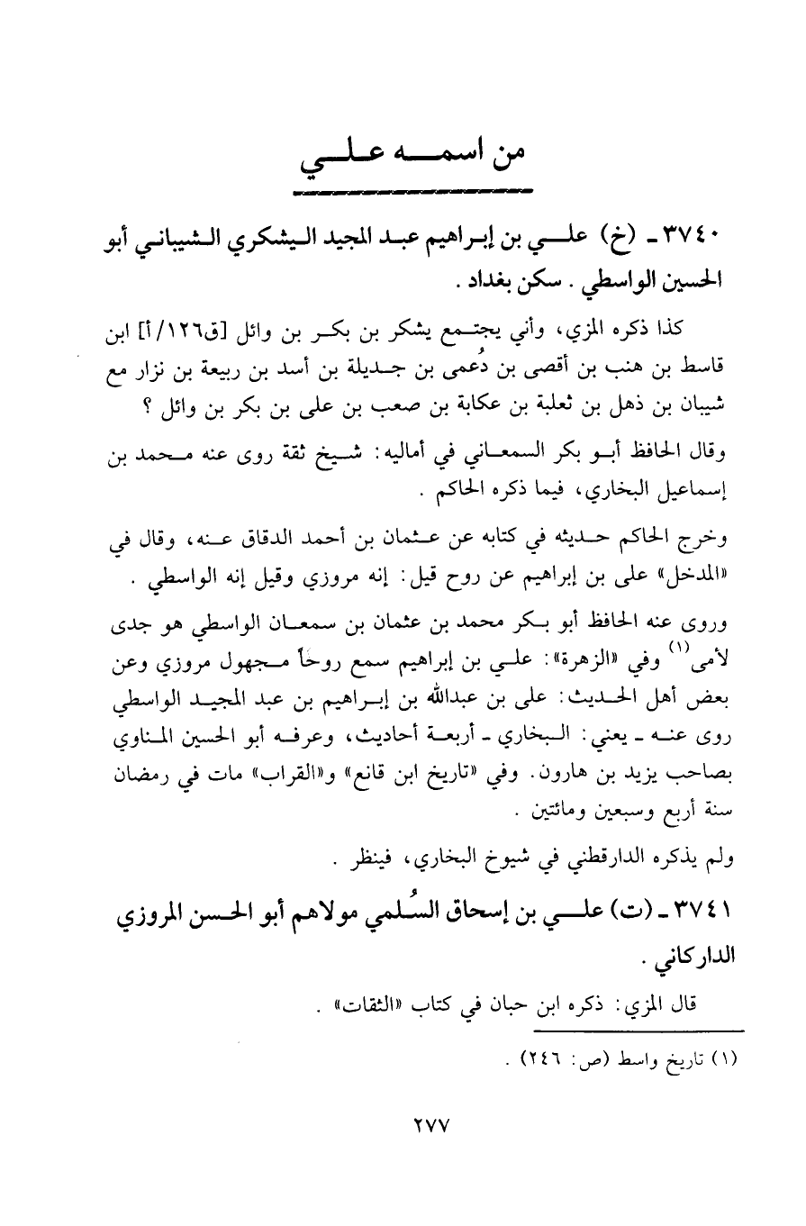 ٣٧٤٠ - (خ) علي بن إبراهيم عبد المجيد اليشكري الشيباني أبو الحسين الواسطي. سكن بغداد.