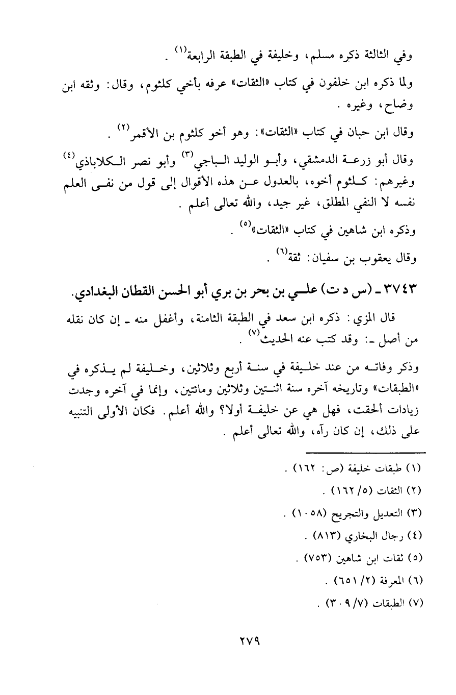 وذكر وفاته من عند خليفة في سنة أربع وثلاثين، وخليفة لم يذكره في " الطبقات " وتاريخه آخره سنة اثنتين وثلاثين ومائتين، وإنما في آخره وجدت زيادات ألحقت، فهل هي عن خليفة أو لا؟ والله أعلم. فكان الأولى التنبيه على ذلك، إن كان رآه، والله تعالى أعلم.