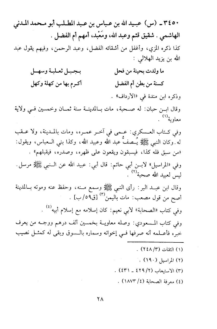 ٣٤٥٠ - (س) عبيد الله بن عباس بن عبد المطلب أبو محمد المدني الهاشمي. شقيق قثم وعبد الله، ومعبد، أمهم أم الفضل.