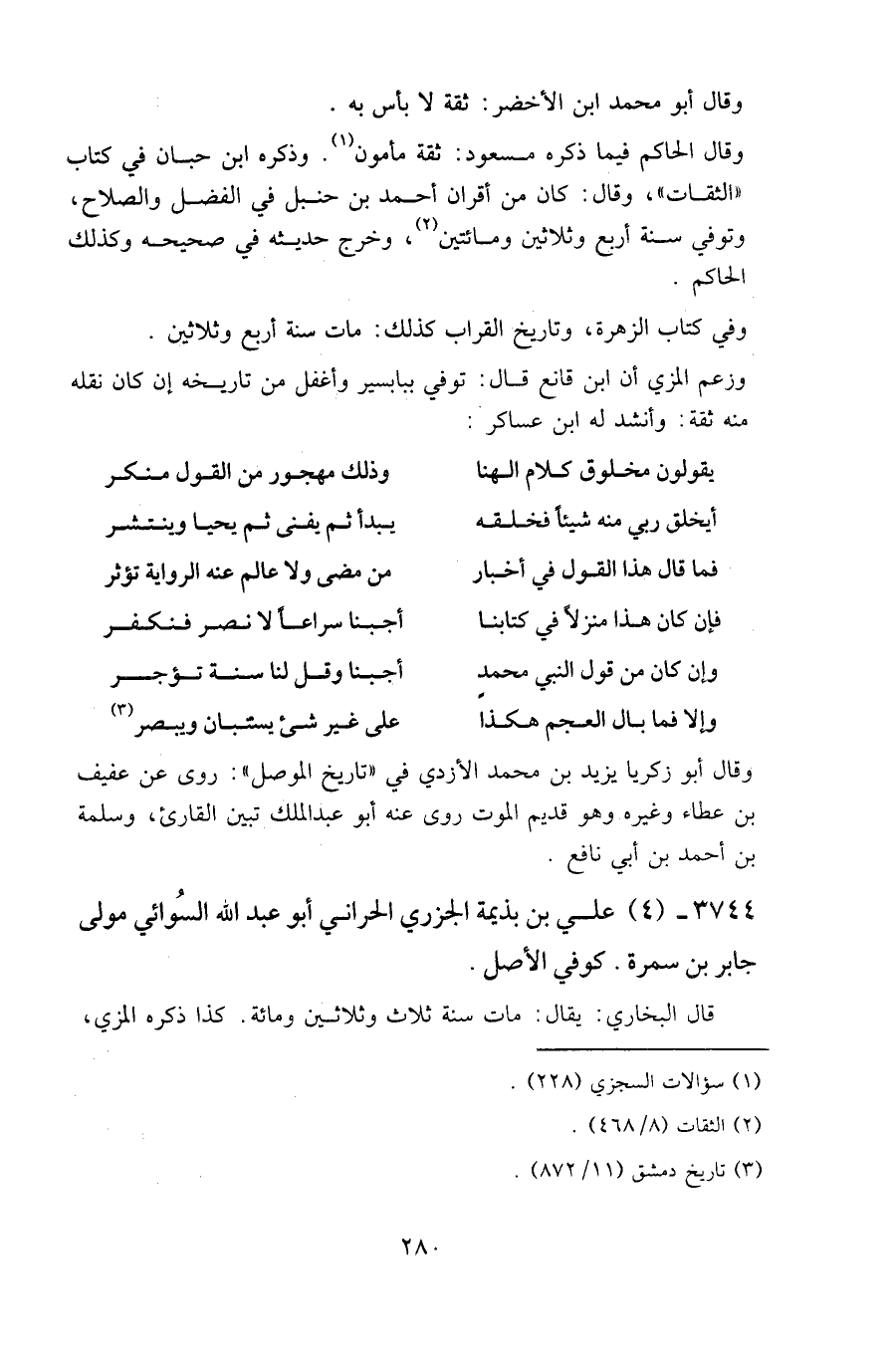 ٣٧٤٤ - (٤) علي بن بذيمة الجزري الحراني أبو عبد الله السوائي مولى جابر بن سمرة، كوفي الأصل.