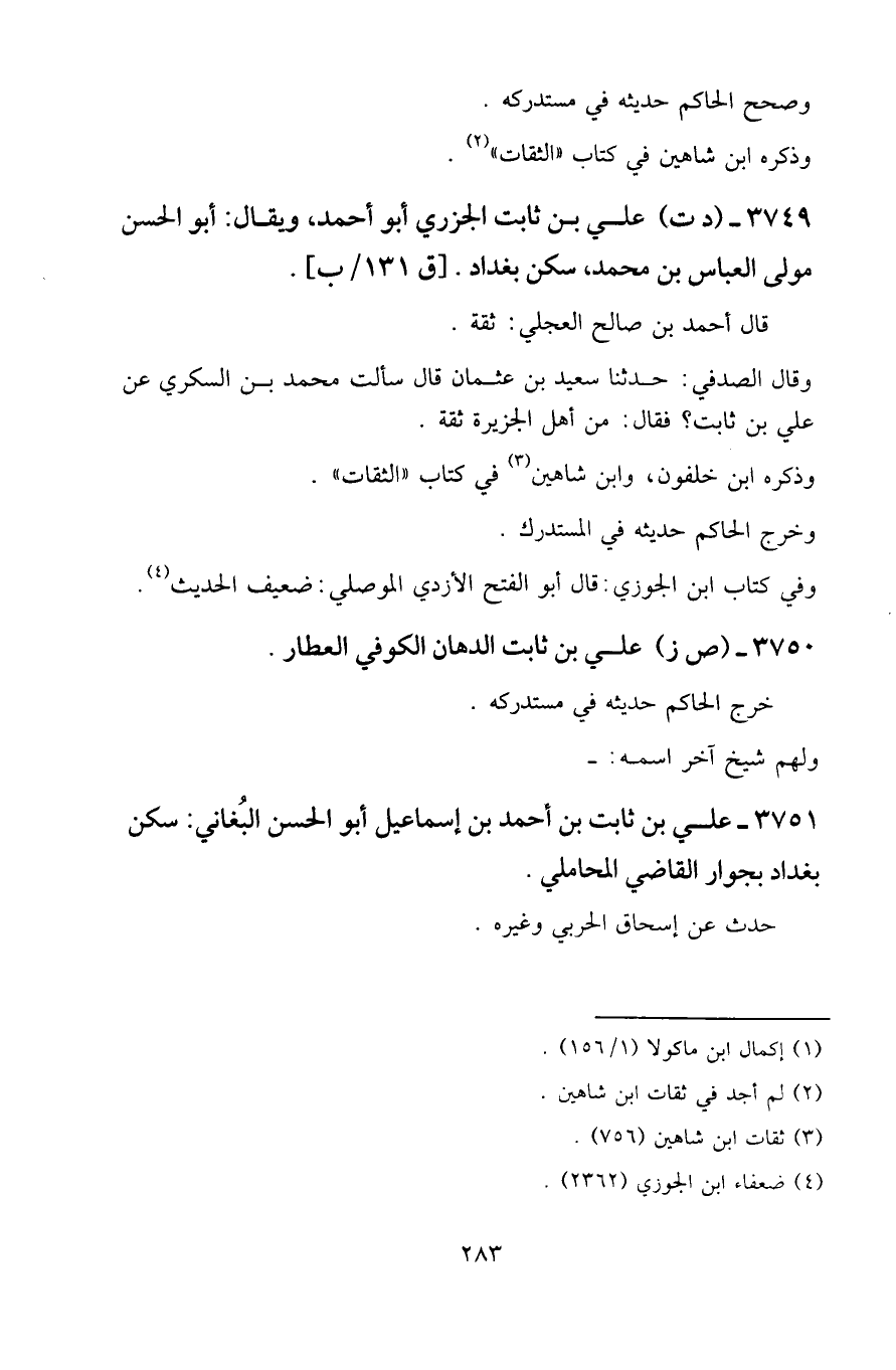 ٣٧٤٩ - (د ت) علي بن ثابت الجزري أبو أحمد، ويقال: أبو الحسن مولى العباس بن محمد، سكن بغداد. [ق ١٣١ / ب].