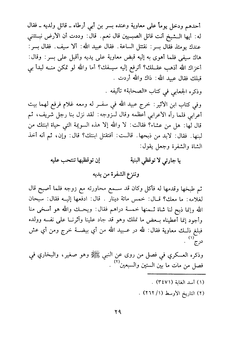 وفي كتاب ابن الأثير: خرج عبيد الله في سفر له ومعه غلام فرفع لهما بيت أعرابي فلما رآه الأعرابي أعظمه وقال لزوجه: لقد نزل بنا رجل شريف، ثم قال لها: هل من عشاء؟ فقالت: لا والله إلا هذه السويمة التي حياة ابنتك من لبنها. فقال: لابد من ذبحها. قالت: أفتقتل ابنتك؟ قال: وإن، ثم أنه أخذ الشاة والشفرة وجعل يقول:
