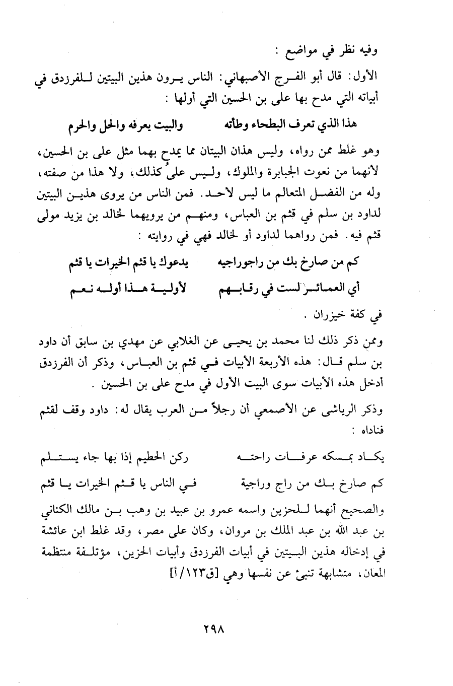 الأول: قال أبو الفرج الأصبهاني: الناس يرون هذين البيتين للفرزدق في أبياته التي مدح بها علي بن الحسين التي أولها: