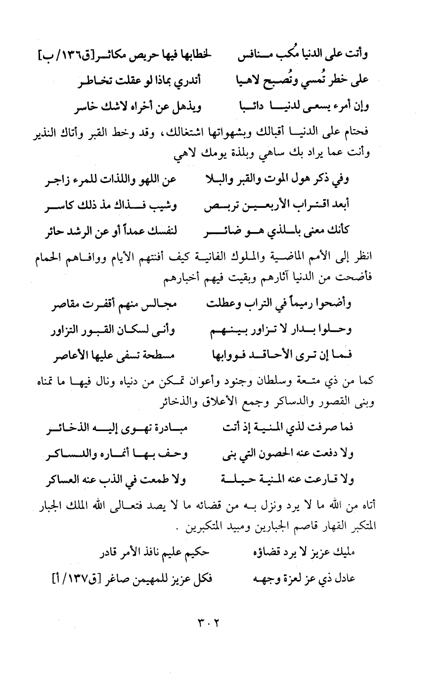 عادل ذي عز لعزة وجهه ... فكل عزيز للمهيمن صاغر [ق ١٣٧ / أ]