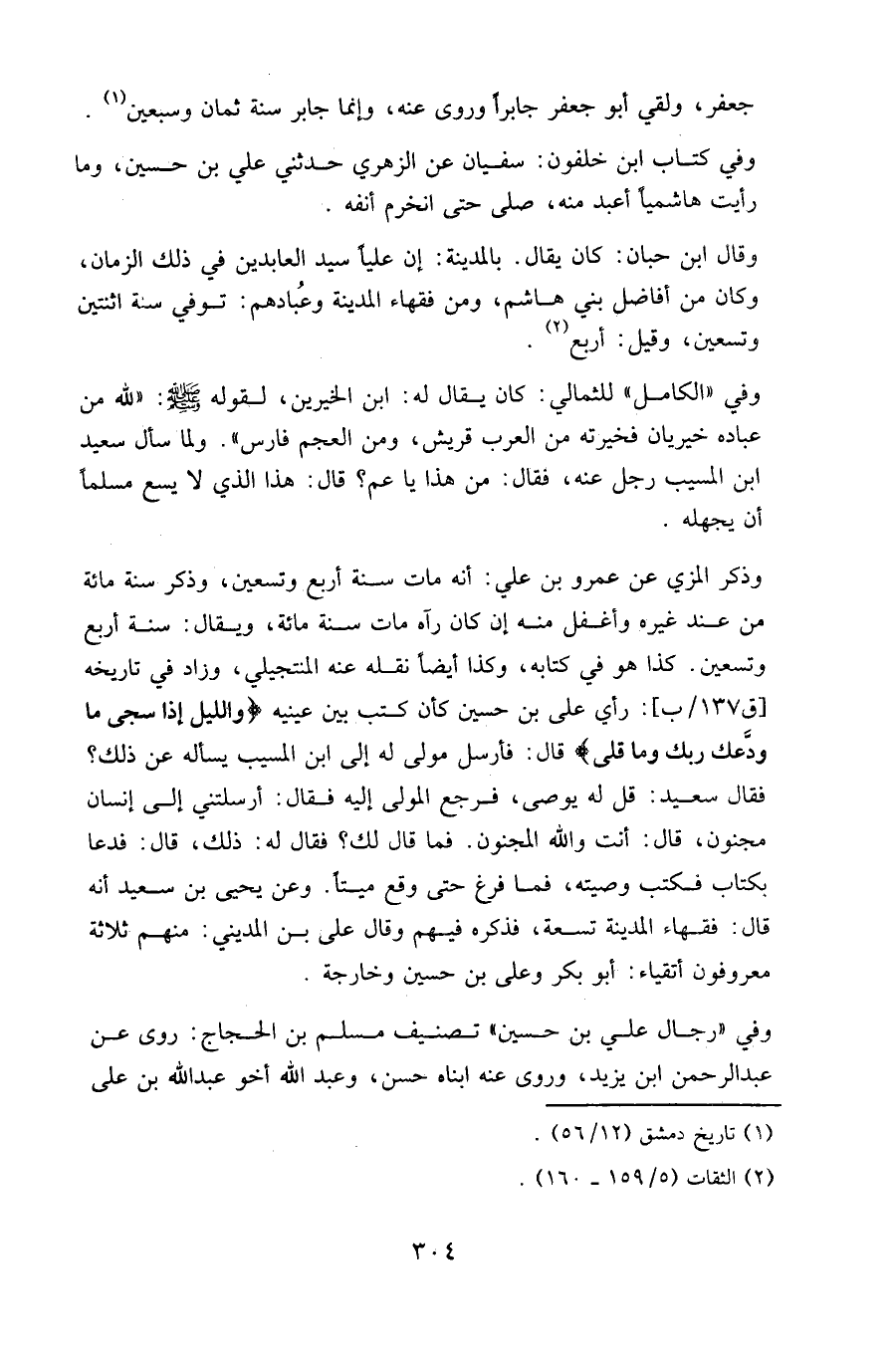 وقال ابن حبان: كان يقال. بالمدينة: إن عليا سيد العابدين في ذلك الزمان، وكان من أفاضل بني هاشم، ومن فقهاء المدينة وعبادهم: توفي سنة اثنتين وتسعين، وقيل: أربع.