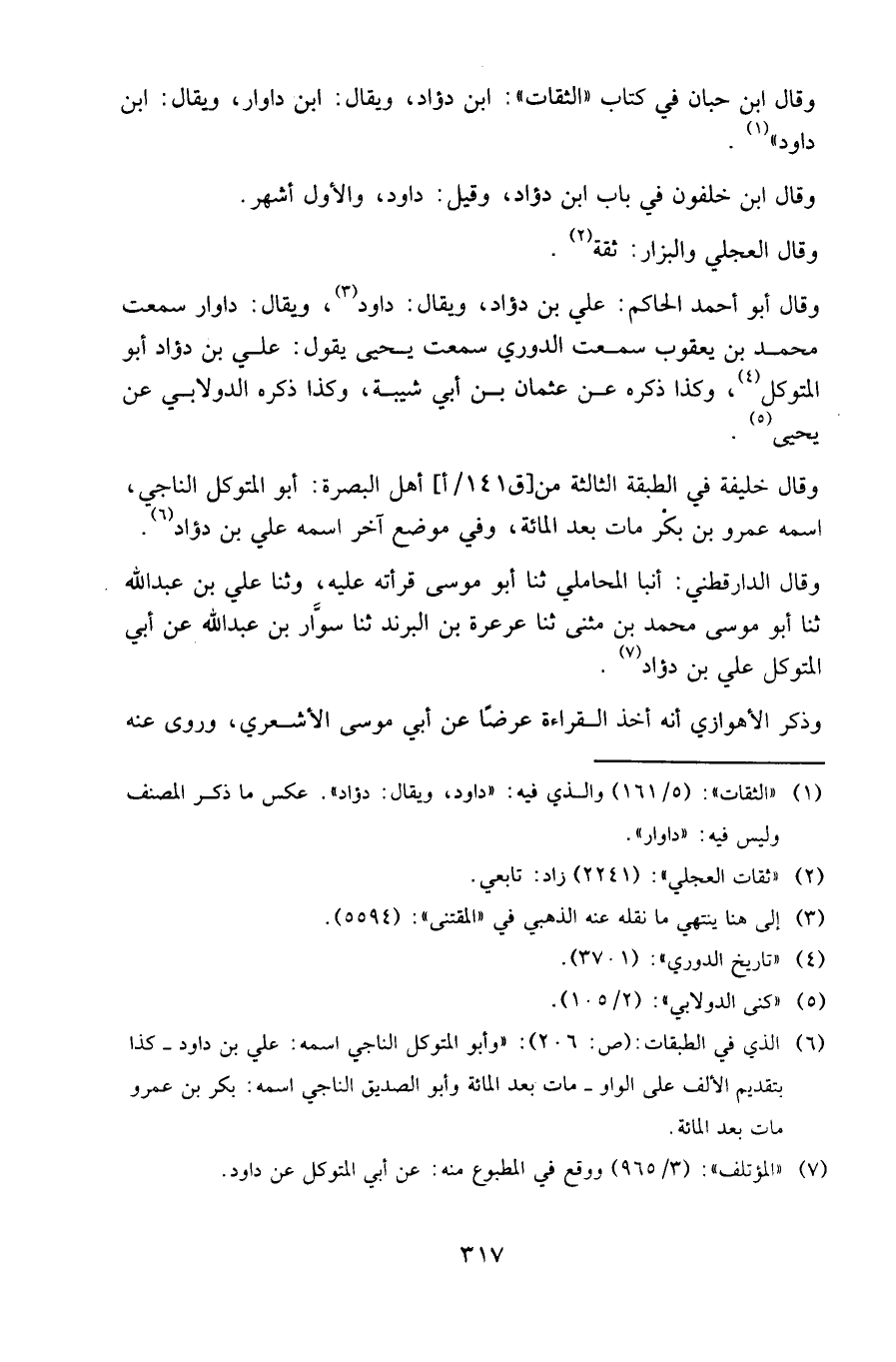وقال الدارقطني: أنبا المحاملي، ثنا أبو موسى قرأته عليه، وثنا علي بن عبد الله، ثنا أبو موسى محمد بن مثنى، ثنا عرعرة بن البرند، ثنا سوار بن عبد الله عن أبي المتوكل علي بن دؤاد.