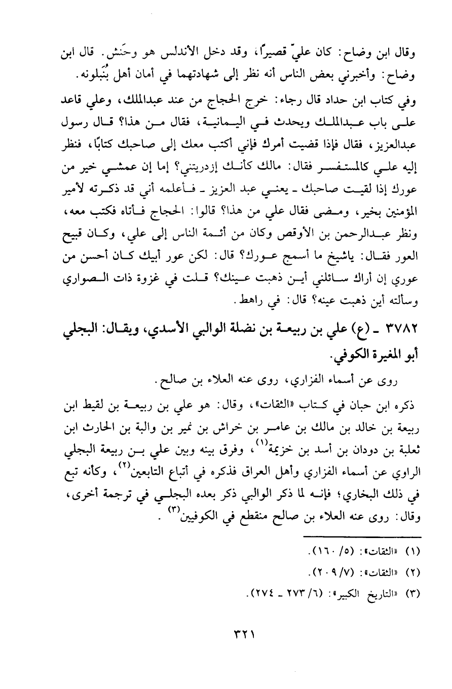 ٣٧٨٢ - (ع) علي بن ربيعة بن نضلة الوالبي الأسدي، ويقال: البجلي أبو المغيرة الكوفي.