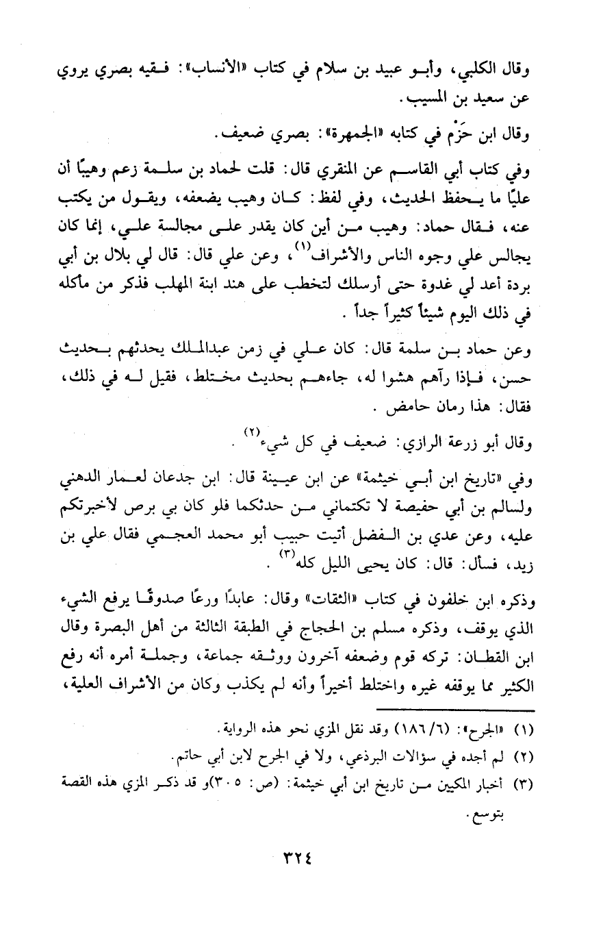 وفي " تاريخ ابن أبي خيثمة " عن ابن عيينة قال: ابن جدعان لعمار الدهني ولسالم بن أبي حفيصة لا تكتماني من حدثكما فلو كان بي برص لأخبرتكم عليه، وعن عدي بن الفضل أتيت حبيب أبو محمد العجمي، فقال علي بن زيد، فسأل: قال: كان يحيي الليل كله.