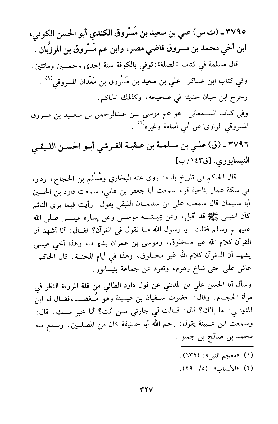 وفي كتاب ابن عساكر: علي بن سعيد بن مسروق بن معدان المسروقي.