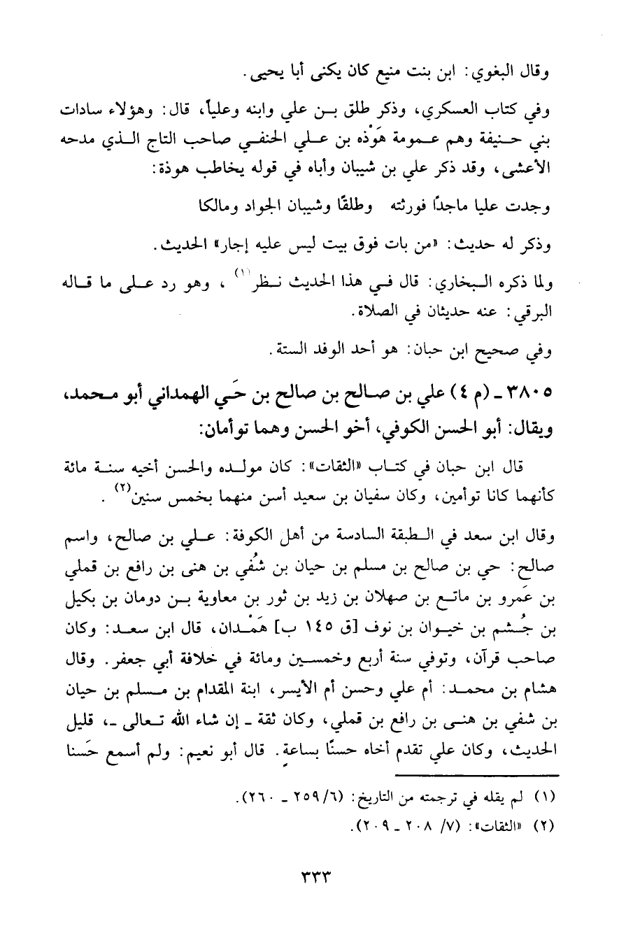 وقال ابن سعد في الطبقة السادسة من أهل الكوفة: علي بن صالح، واسم صالح: حي بن صالح بن مسلم بن حيان بن شفي بن هني بن رافع بن قملي بن عمرو بن ماتع بن صهلان بن زيد بن ثور بن معاوية بن دومان بن بكيل بن جشم بن خيوان بن نوف [ق ١٤٥ / ب] همدان، قال ابن سعد: وكان صاحب قرآن، وتوفي سنة أربع وخمسين ومائة في خلافة أبي جعفر. وقال هشام بن محمد: أم علي وحسن أم الأيسر، ابنة المقدام بن مسلم بن حيان بن شفي بن هني بن رافع بن قملي، وكان ثقة – إن شاء الله تعالى – قليل الحديث، وكان علي تقدم أخاه حسنا بساعة. قال أبو نعيم: ولم أسمع حسنا