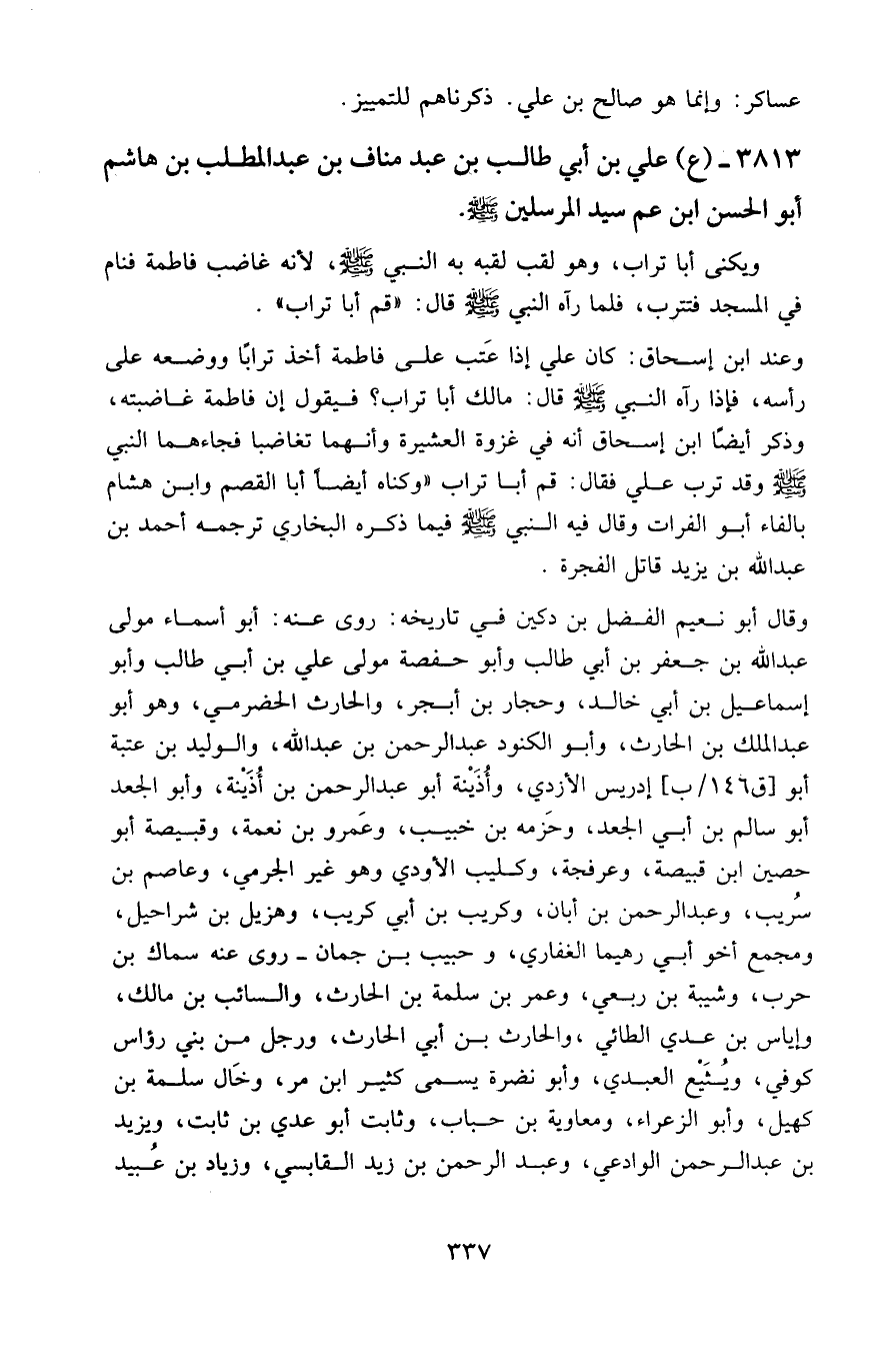٣٨١٣ - (ع) علي بن أبي طالب بن عبد مناف بن عبد المطلب بن هاشم أبو الحسن ابن عم سيد المرسلين - صلى الله عليه وسلم -.