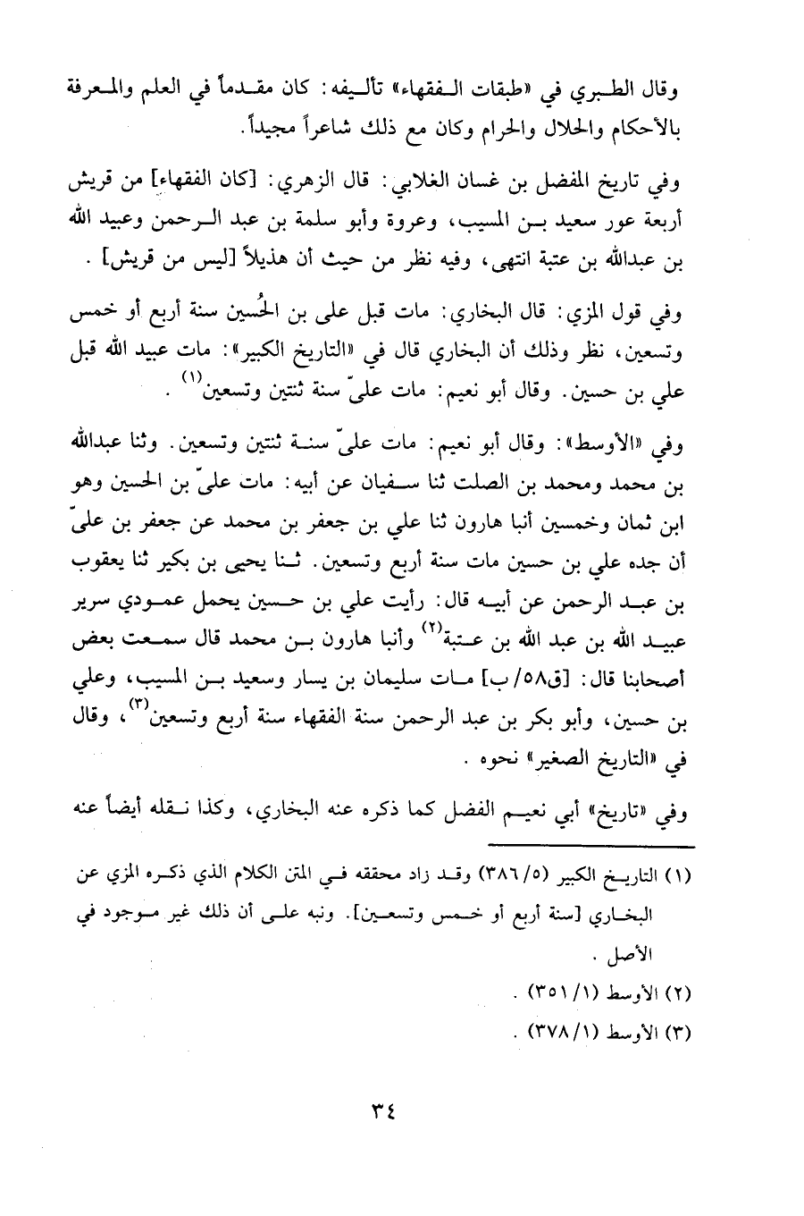 وفي " الأوسط ": وقال أبو نعيم: مات علي سنة ثنتين وتسعين. وثنا عبد الله بن محمد ومحمد بن الصلت، ثنا سفيان عن أبيه: مات علي بن الحسين وهو ابن ثمان وخمسين، أنبا هارون، ثنا علي بن جعفر بن محمد، عن جعفر بن علي أن جده علي بن حسين مات سنة أربع وتسعين. ثنا يحيى بن بكير، ثنا يعقوب بن عبد الرحمن، عن أبيه قال: رأيت علي بن حسين يحمل عمودي سرير عبيد الله بن عبد الله بن عتبة، وأنبا هارون بن محمد قال سمعت بعض أصحابنا قال: [ق ٥٨ / ب] مات سليمان بن يسار وسعيد بن المسيب، وعلي بن حسين، وأبو بكر بن عبد الرحمن سنة الفقهاء سنة أربع وتسعين، وقال في " التاريخ الصغير "، نحوه.