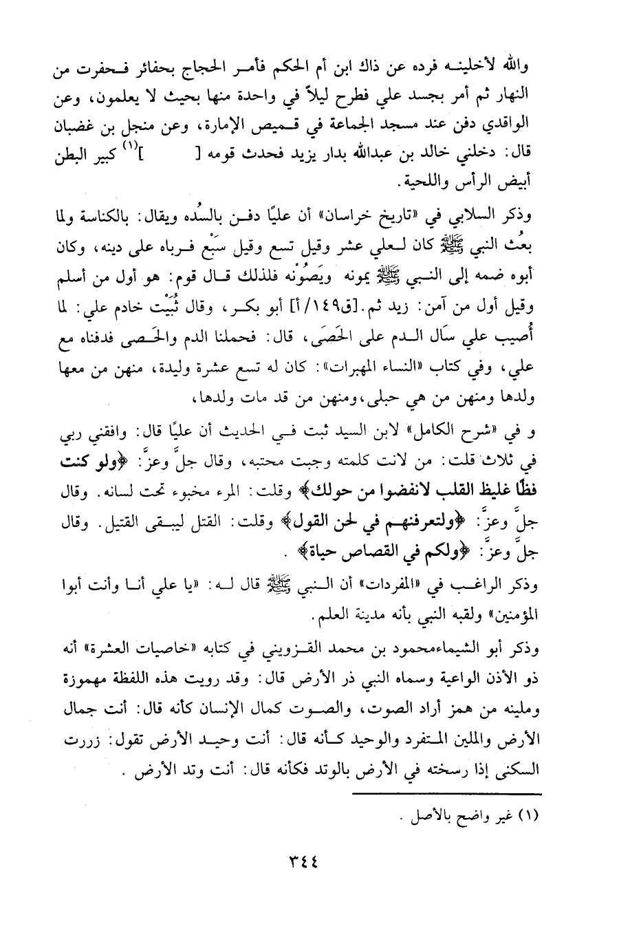 وذكر السلابي في " تاريخ خراسان " أن عليا دفن بالسدة، ويقال: بالكناسة، ولما بعث النبي - صلى الله عليه وسلم - كان لعلي عشر وقيل تسع وقيل سبع فرباه على دينه، وكان أبوه ضمه إلى النبي - صلى الله عليه وسلم - يمونه ويصونه؛ فلذلك قال قوم: هو أول من أسلم، وقيل أول من آمن: زيد ثم. [ق ١٤٩ / أ] أو بكر، وقال ثبيت خادم علي: لما أصيب علي سال الدم على الحصى، قال: فحملنا الدم والحصى، فدفناه مع علي، وفي كتاب " النساء المهبرات ": كان له تسع عشرة وليدة، ومنهن من معها ولدها ومنهن من هي حبلى، ومنهن من قد مات ولدها،