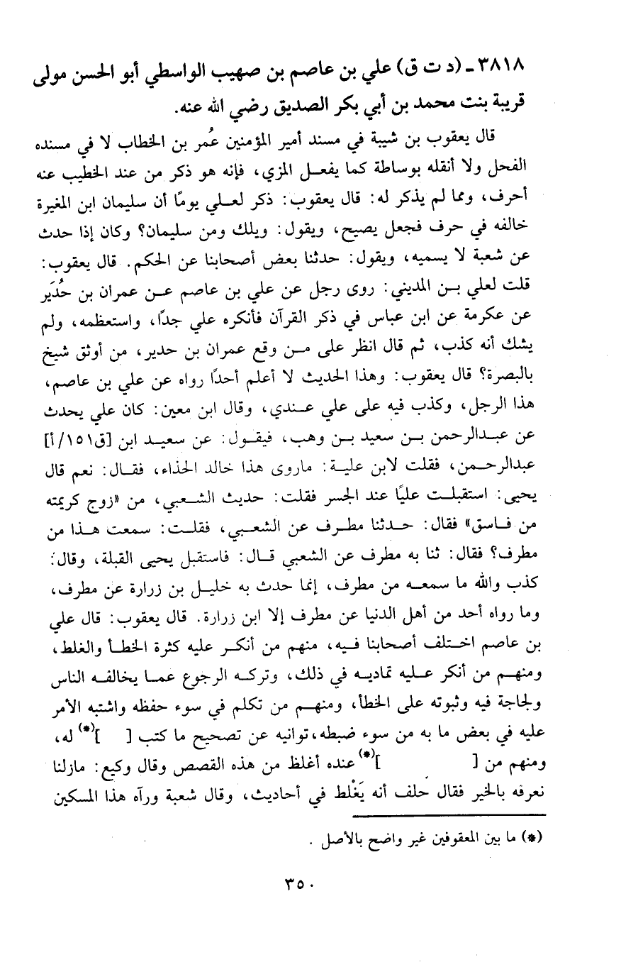 ٣٨١٨ - (د ت ق) علي بن عاصم بن صهيب الواسطي أبو الحسن مولى قريبة بنت محمد بن أبي بكر الصديق رضي الله عنه.