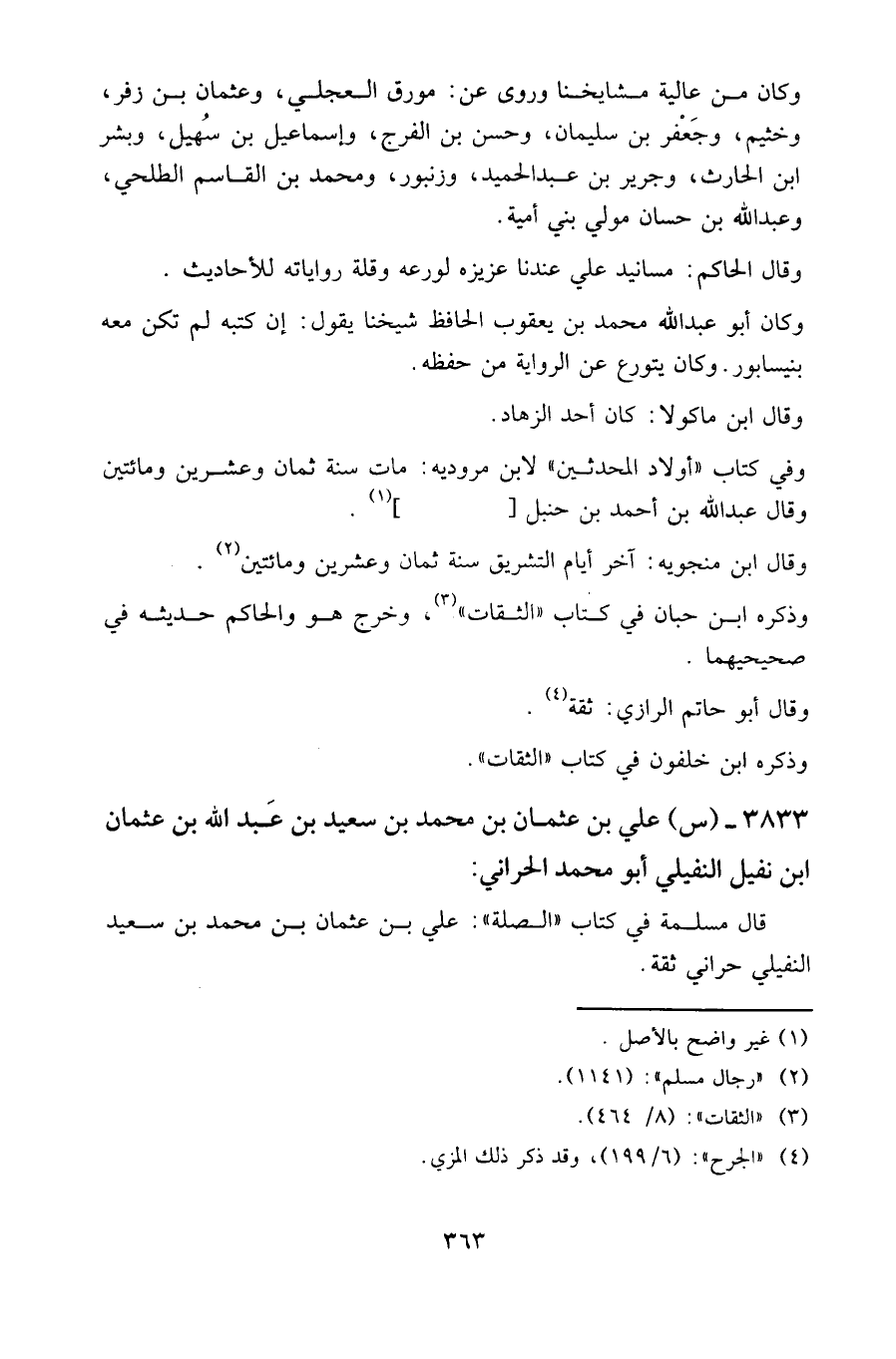٣٨٣٣ - (س) علي بن عثمان بن محمد بن سعيد بن عبد الله بن عثمان بن نفيل النفيلي أبو محمد الحراني:
