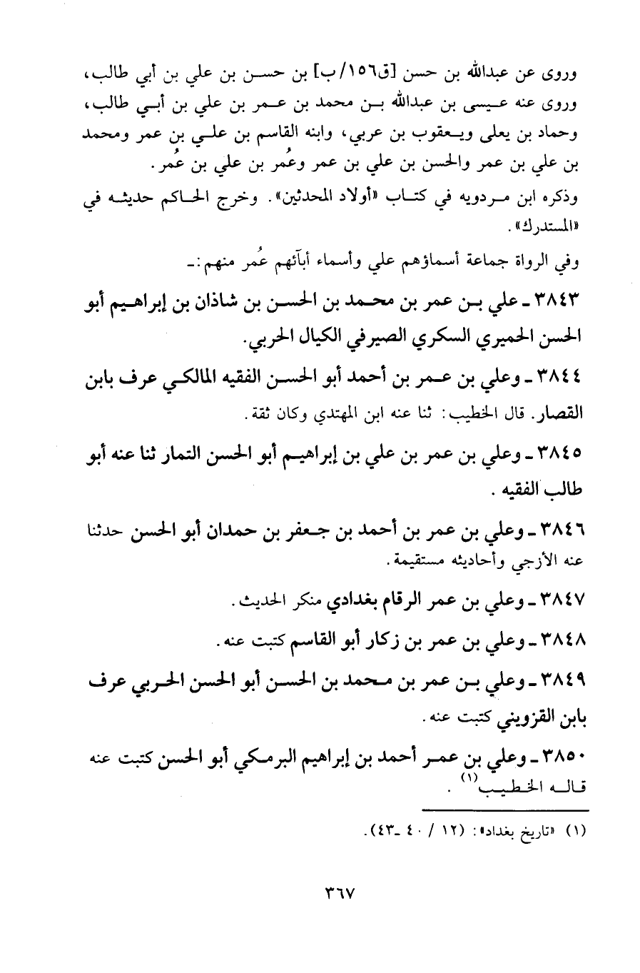 ٣٨٤٣ - علي بن عمر بن محمد بن الحسن بن شاذان بن إبراهيم أبو الحسن الحميري السكري الصيرفي الكيال الحربي.