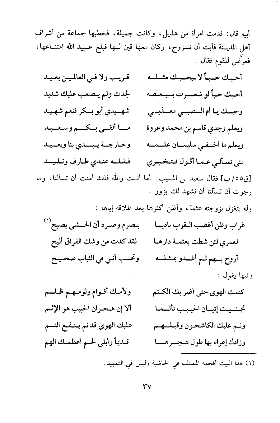 أبيه قال: قدمت امرأة من هذيل، وكانت جميلة، فخطبها جماعة من أشراف أهل المدينة فأبت أن تتزوج، وكان معها قين لها فبلغ عبيد الله امتناعها، فعرض للقوم فقال:
