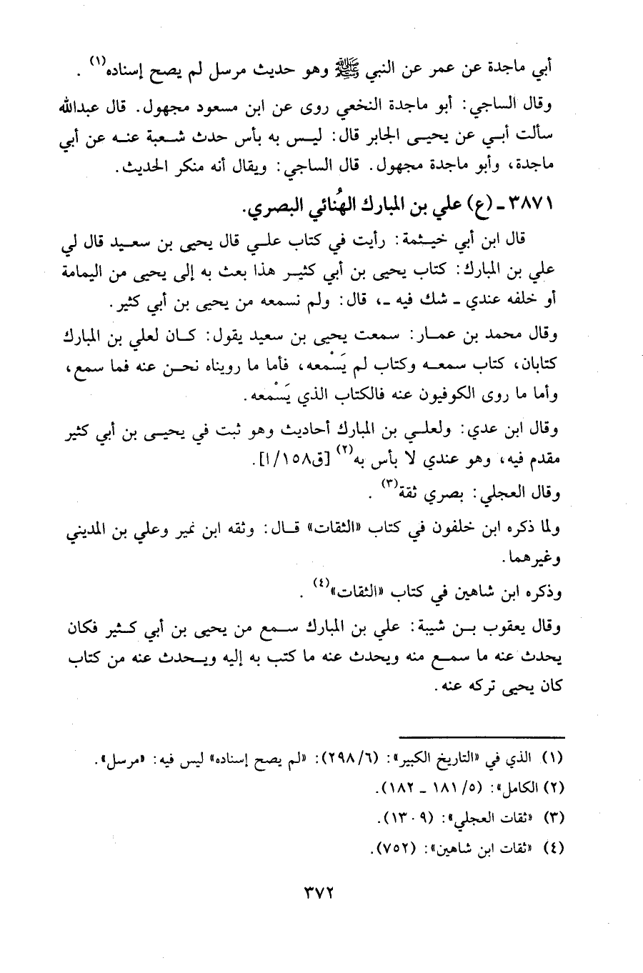 وقال ابن عدي: ولعلي بن المبارك أحاديث وهو ثبت في يحيى بن أبي كثير مقدم فيه، وهو عندي لا بأس به [ق ١٥٨ / أ].