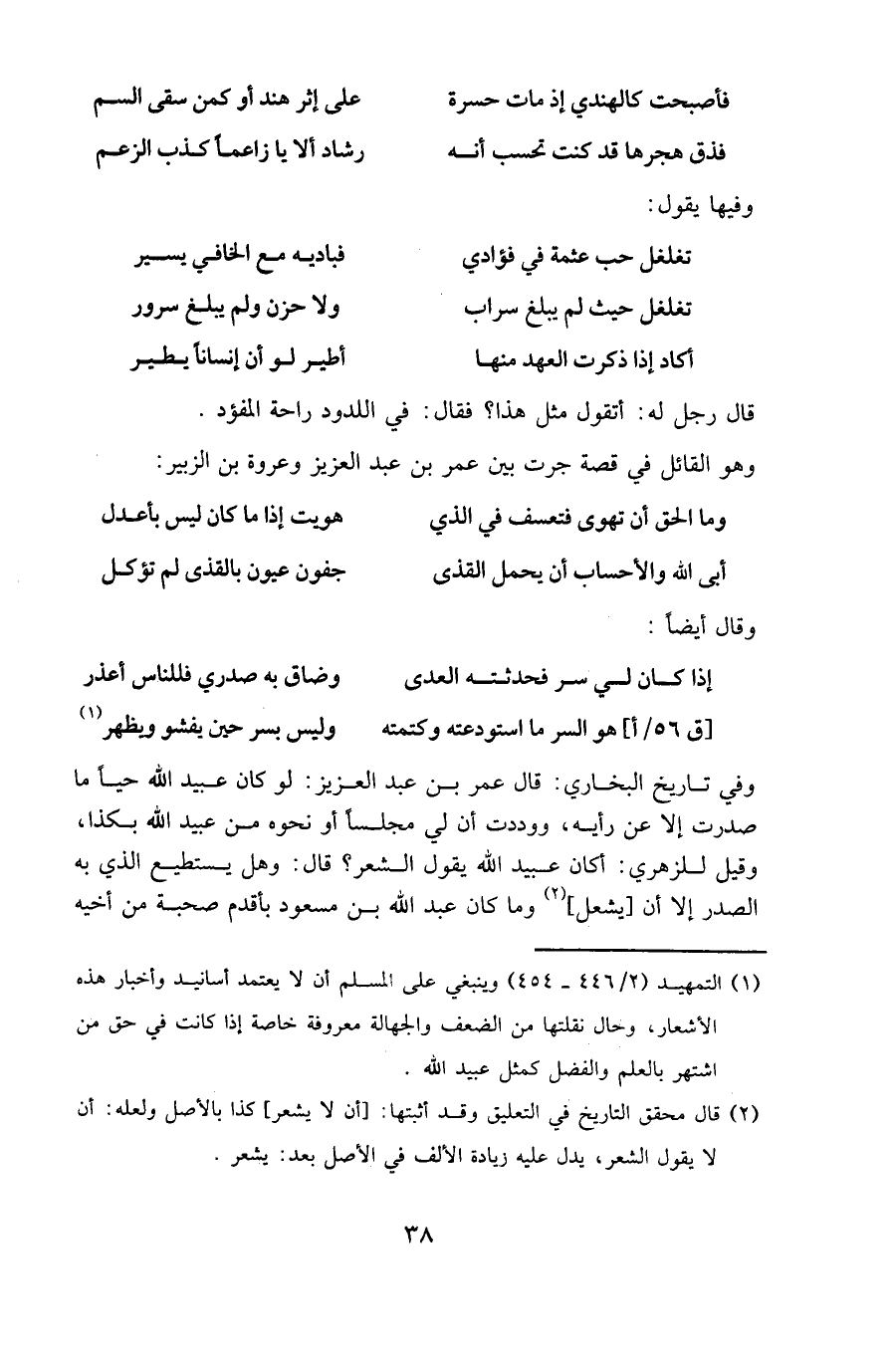 وهو القائل في قصة جرت بين عمر بن عبد العزيز وعروة بن الزبير: