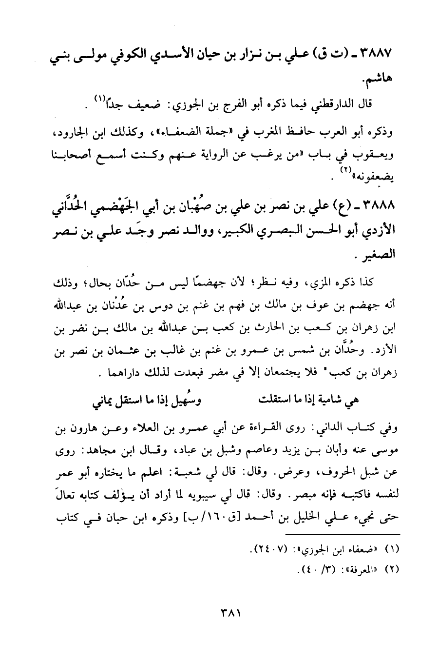 ٣٨٨٧ - (ت ق) علي بن نزار بن حيان الأسدي الكوفي مولى بني هاشم.