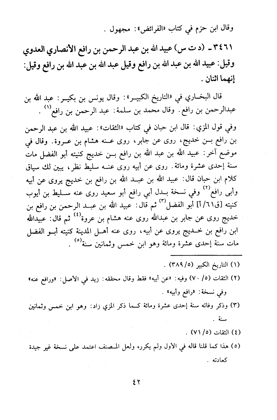 ٣٤٦١ - (د ت س) عبيد الله بن عبد الرحمن بن رافع الأنصاري العدوي وقيل: عبيد الله بن عبد الله بن رافع وقيل: عبد الله بن عبد الله بن رافع، وقيل: إنهما اثنان.