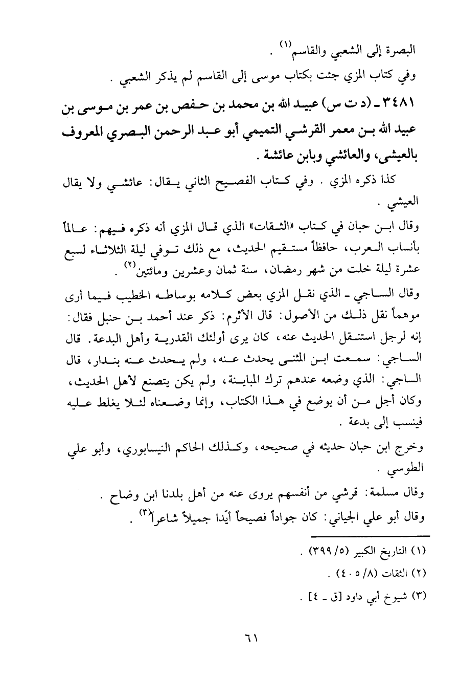 ٣٤٨١ - (د ت س) عبيد الله بن محمد بن حفص بن عمر بن موسى بن عبيد الله بن معمر القرشي التميمي أبو عبد الرحمن البصري المعروف بالعيشي، والعائشي، وبابن عائشة.