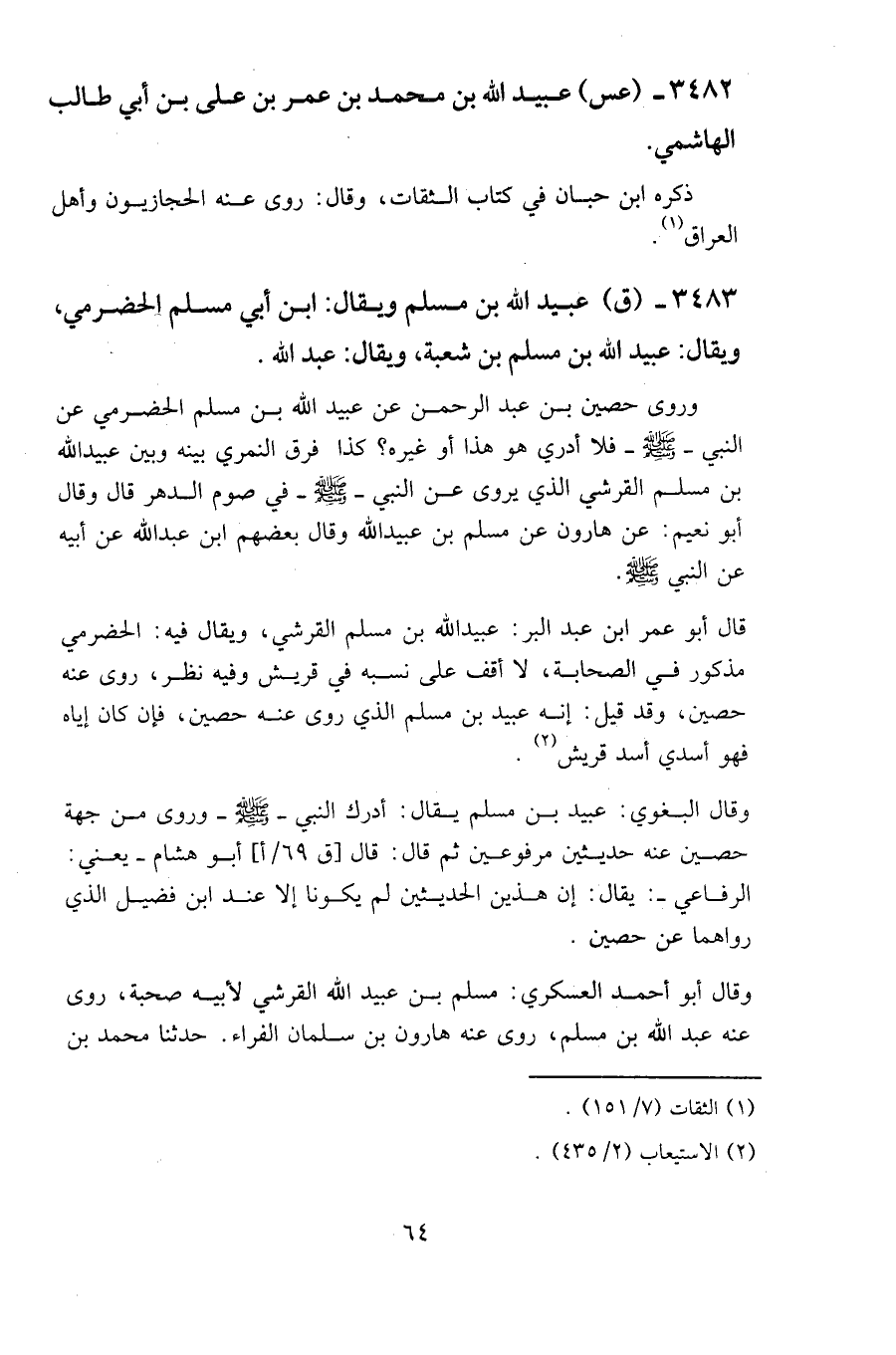 وروى حصين بن عبد الرحمن عن عبيد الله بن مسلم الحضرمي عن النبي - صلى الله عليه وسلم - فلا أدري هو هذا أو غيره؟ كذا فرق النمري بينه وبين عبيد الله بن مسلم القرشي الذي يروي عن النبي - صلى الله عليه وسلم - في صوم الدهر. قال: وقال أبو نعيم: عن هارون، عن مسلم بن عبيد الله وقال بعضهم: ابن عبد الله، عن أبيه، عن النبي - صلى الله عليه وسلم -.