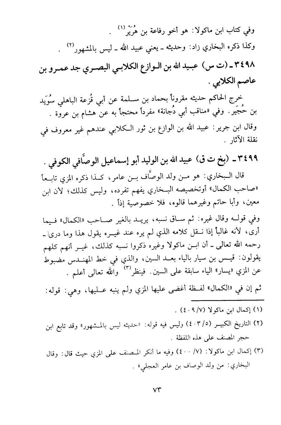 وفي قوله وقال غيره: ثم ساق نسبه، ويريد بالغير صاحب " الكمال " فيما أرى؛ لأنه غالبا إذا نقل كلامه الذي لم يره عند غيره يقول هذا وما درى – رحمه الله تعالى – أن ابن ماكولا وغيره ذكروا نسبه كذلك، غير أنهم كلهم يقولون: قيس بن سيار بالياء بعد السين، والذي في خط المهندس مضبوط عن المزي " يسار " الياء سابقة على السين. فينظر، والله تعالى أعلم.