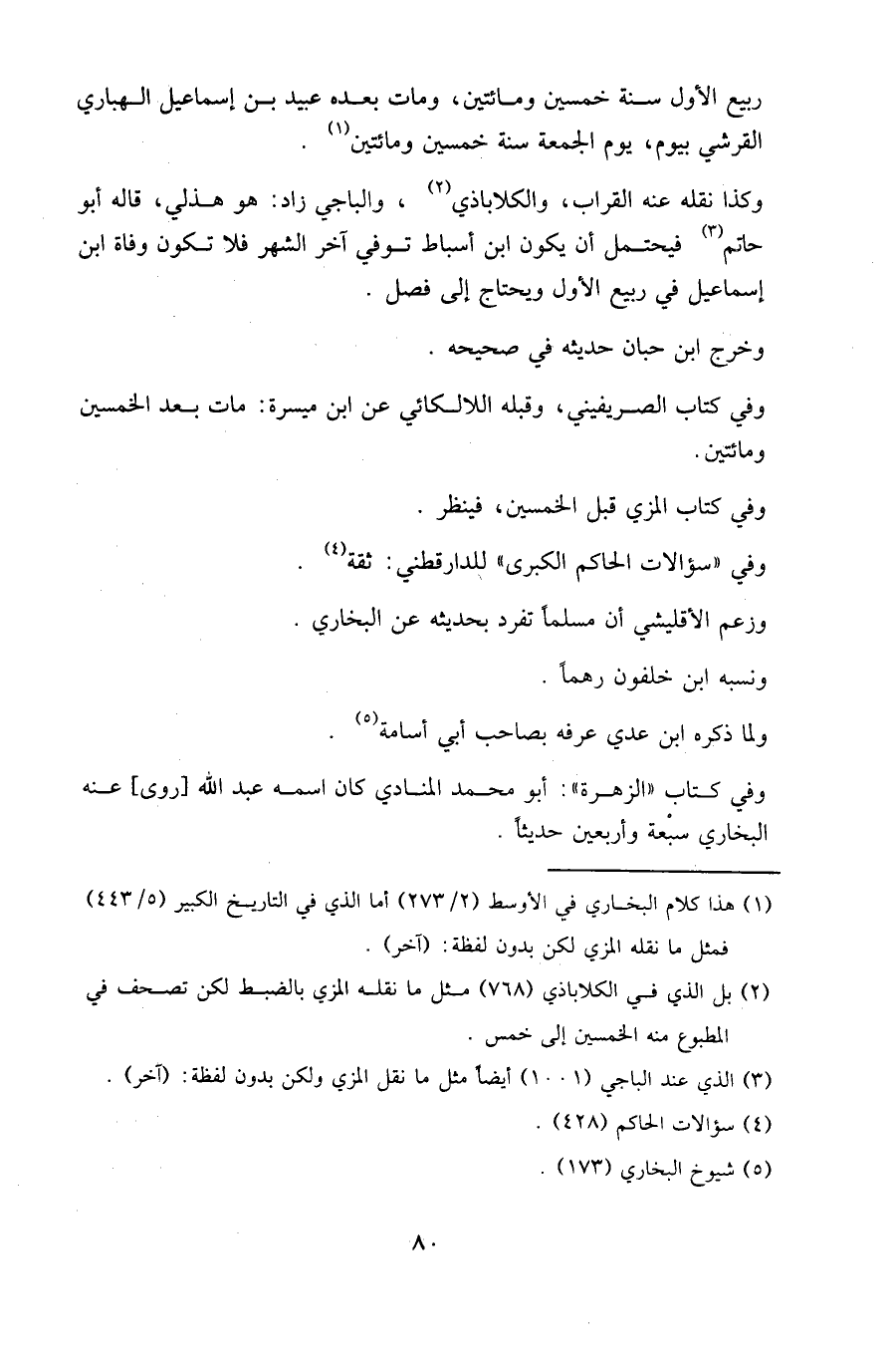 وكذا نقله عنه القراب، والكلاباذي، والباجي زاد: هو هذلي، قاله أبو حاتم، فيحتمل أن يكون ابن أسباط توفي آخر الشهر، فلا تكون وفاة ابن إسماعيل في ربيع الأول ويحتاج إلى فصل.