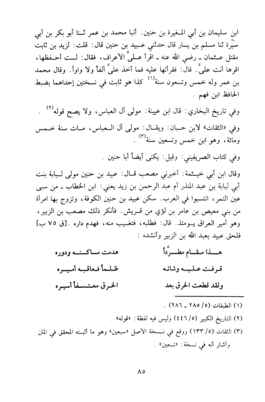 ابن سليمان بن أبي المغيرة بن حنين. أنبا محمد بن عمر، ثنا أبو بكر بن أبي سبرة، ثنا مسلم بن يسار، قال حدثني عبيد بن حنين، قال: قلت: لزيد بن ثابت مقتل عثمان - رضي الله عنه - اقرأ علي الأعراف، فقال: لست أحفظها، اقرأها أنت علي. قال: فقرأتها عليه فما أخذ علي ألفا ولا واوا. وقال محمد بن عمر وله خمس وتسعون سنة، كذا هو ثابت في نسختين إحداهما بضبط الحافظ ابن فهم.