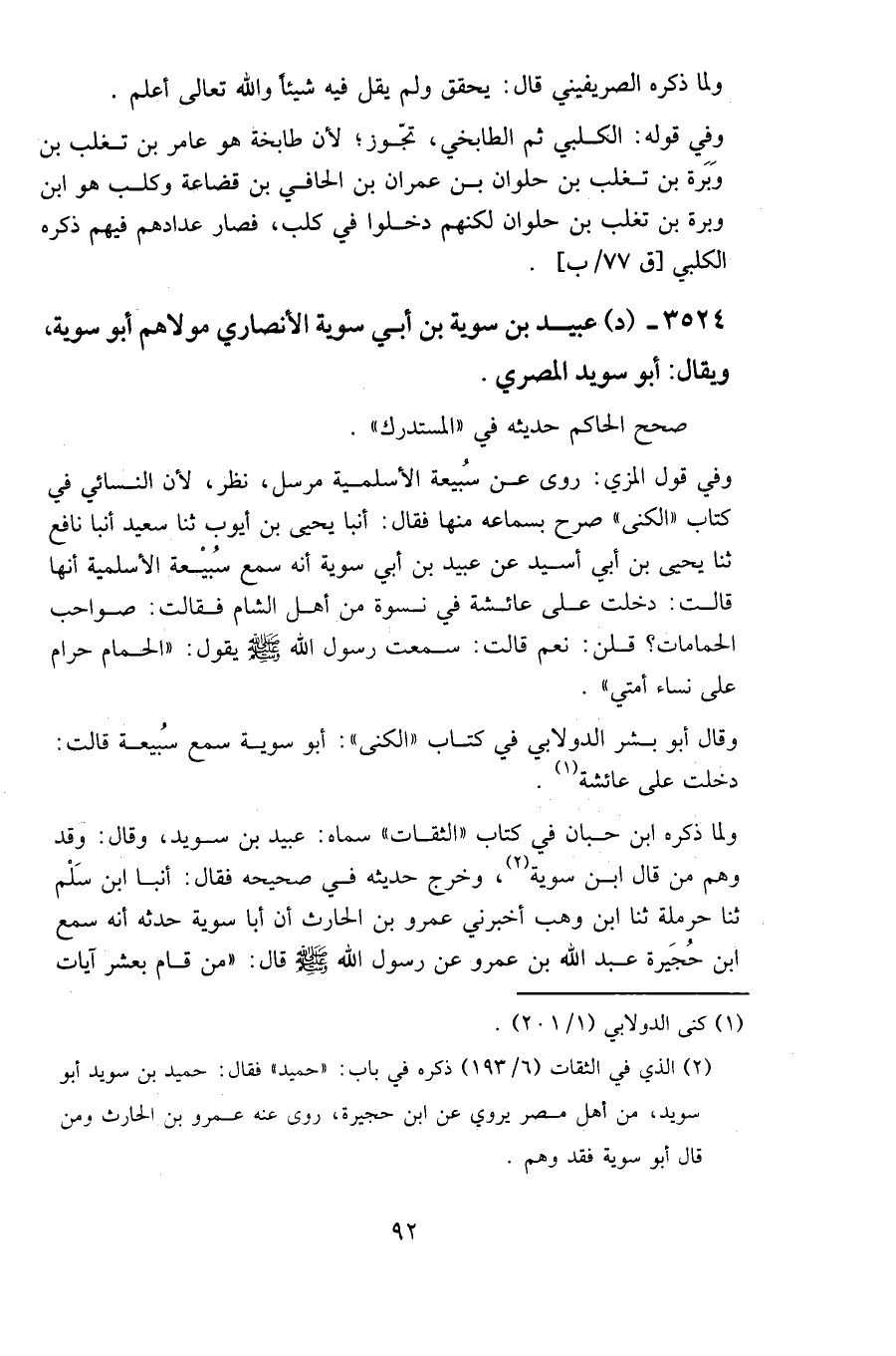 وفي قول المزي: روى عن سبيعة الأسلمية مرسل، نظر؛ لأن النسائي في كتاب " الكنى " صرح بسماعه منها، فقال: أنبا يحيى بن أيوب، ثنا سعيد، أنبا نافع، ثنا يحيى بن أبي أسيد، عن عبيد بن أبي سوية، أنه سمع سبيعة الأسلمية أنها قالت: دخلت على عائشة في نسوة من أهل الشام، فقالت: صواحب الحمامات؟ قلن: نعم. قالت: سمعت رسول الله - صلى الله عليه وسلم - يقول: " الحمام حرام على نساء أمتي ".