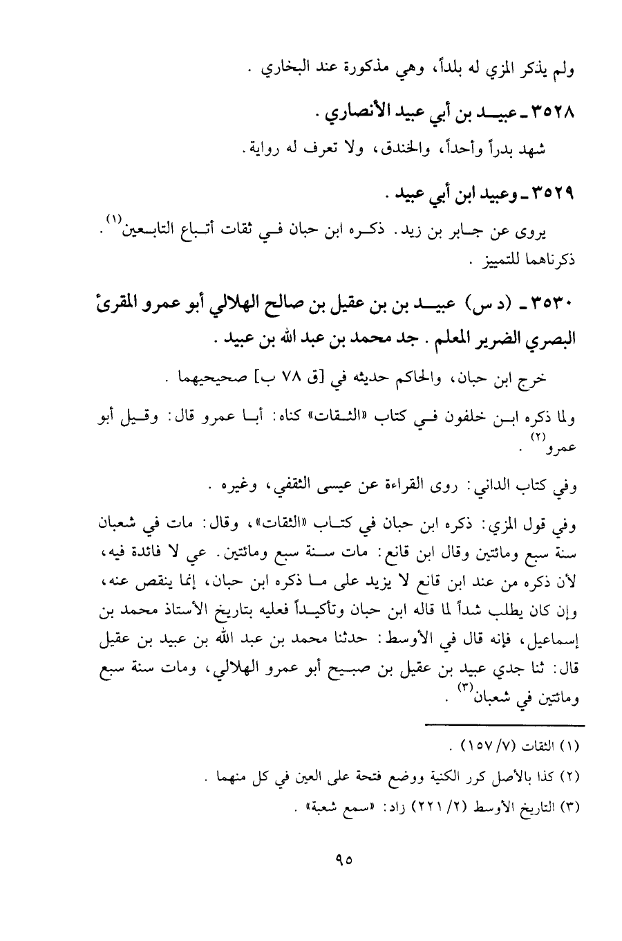 وفي قول المزي: ذكره ابن حبان في كتاب " الثقات " وقال: مات في شعبان سنة سبع ومائتين، وقال ابن قانع: مات سنة سبع ومائتين. عي لا فائدة فيه؛ لأن ذكره من عند ابن قانع لا يزيد على ما ذكره ابن حبان، إنما ينقص عنه، وإن كان يطلب شدا لما قاله ابن حبان وتأكيدا فعليه بتاريخ الأستاذ محمد بن إسماعيل، فإنه قال في الأوسط: حدثنا محمد بن عبد الله بن عبيد بن عقيل قال: ، ثنا جدي عبيد بن عقيل بن صبيح أبو عمرو الهلالي، ومات سنة سبع ومائتين في شعبان.