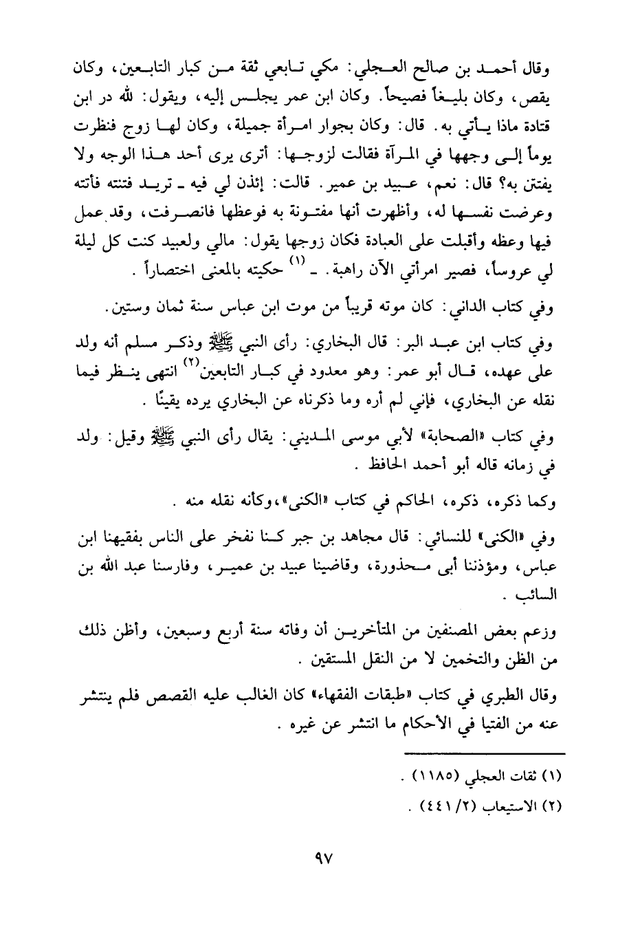وفي كتاب ابن عبد البر: قال البخاري: رأى النبي - صلى الله عليه وسلم - وذكر مسلم أنه ولد على عهده، قال أبو عمر: وهو معدود في كبار التابعين انتهى، ينظر فيما نقله عن البخاري، فإني لم أره وما ذكرناه عن البخاري يرده يقينا.