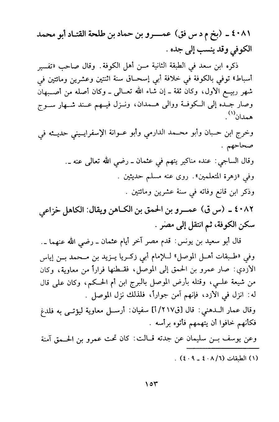 ٤٠٨٢ - (س ق) عمرو بن الحمق بن الكاهن ويقال: الكاهل خزاعي سكن الكوفة ثم انتقل إلى مصر.