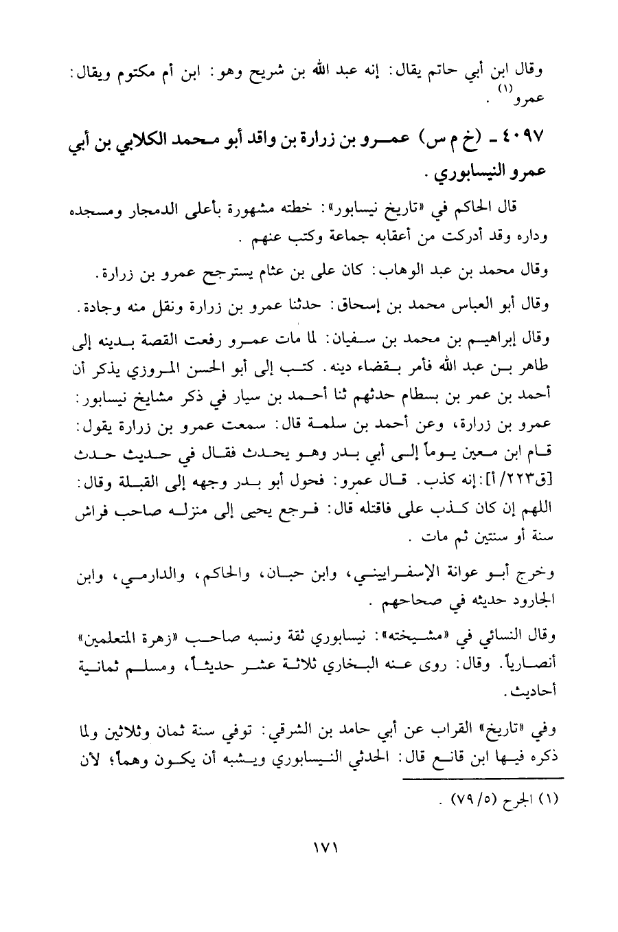 كتب إلى (أبو الحسن المروزي) يذكر أن أحمد بن عمر بن بسطام حدثهم، ثنا أحمد بن سيار في ذكر مشايخ نيسابور: عمرو بن زرارة، وعن أحمد بن سلمة قال: سمعت عمرو بن زرارة يقول: قام ابن معين يومًا إلى أبي بدر وهو يحدث فقال في حديث حدث [ق ٢٢٣/أ]: إنه كذب.