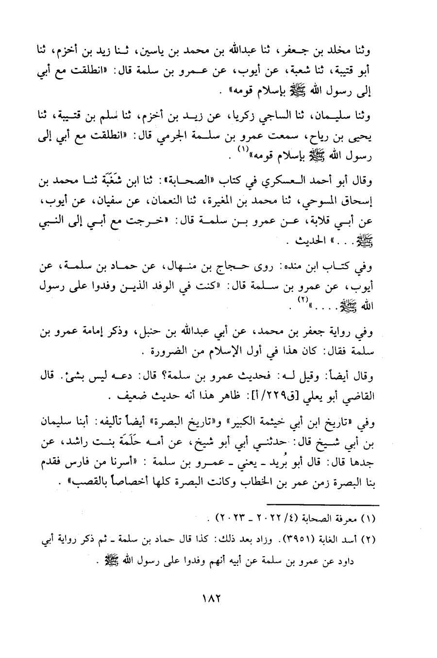 وفي كتاب ابن منده: روى حجاج بن منهال، عن حماد بن سلمة، عن أيوب، عن عمرو بن سلمة قال: " كنت في الوفد الذين وفدوا على رسول الله صلى الله عليه وسلم. . . . "