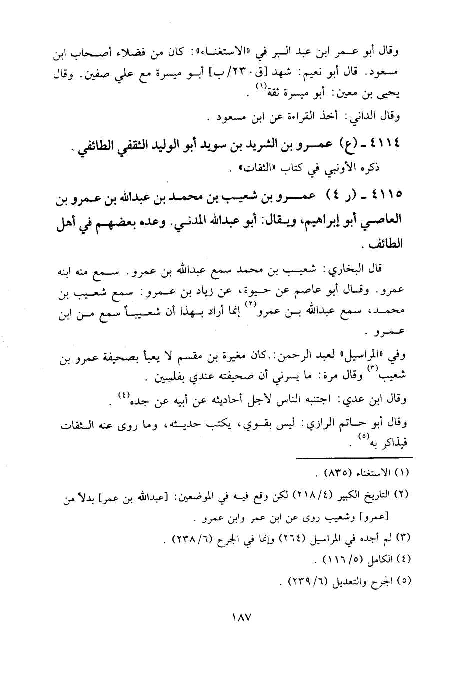 ٤١١٥ - (ر ٤) عمرو بن شعيب بن محمد بن عبد الله بن عمرو بن العاصي أبو إبراهيم، ويقال: أبو عبد الله المدني.