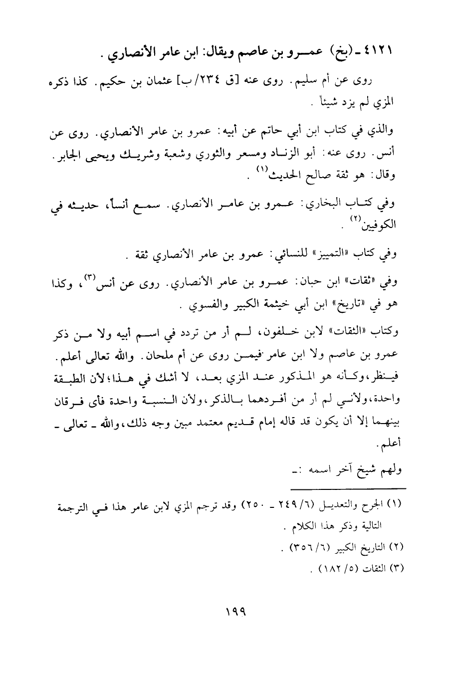 وفي كتاب " التمييز " للنسائي: عمرو بن عامر الأنصاري ثقة.