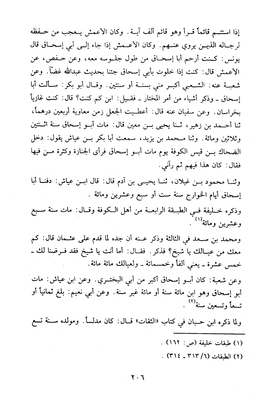 وعن سفيان عنه قال: أعطيت الجعل زمن معاوية أربعين درهمًا، ثنا أحمد بن زهير، ثنا يحيى بن معين قال: مات أبو إسحاق سنة اثنتين وثلاثين ومائة.