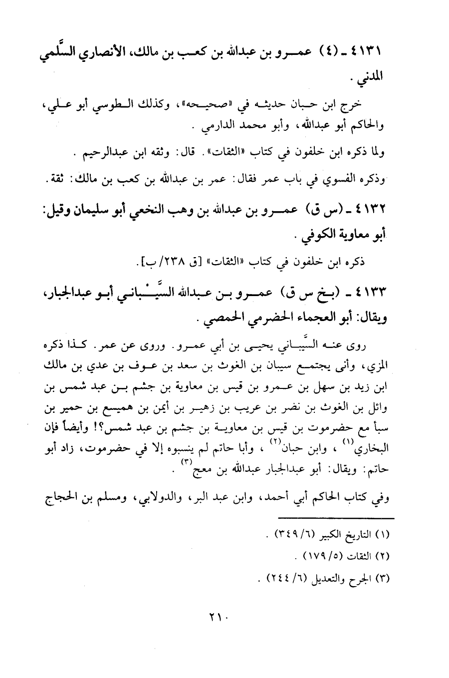٤١٣١ - (٤) عمرو بن عبد الله بن كعب بن مالك، الأنصاري السلمي المدني.