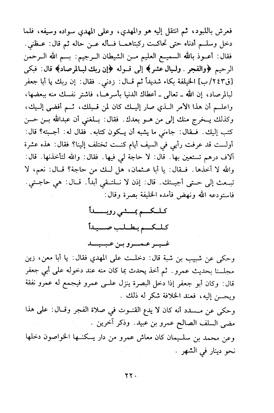 فعرش باللبود، ثم انتقل إليه هو والمهدي، وعلى المهدي سواده وسيفه، فلما دخل وسلم أدناه حتى تحاكت ركبتاهما فسأله عن حاله ثم قال: عظني. فقال: أعوذ بالله السميع العليم من الشيطان الرجيم، بسم الله الرحمن الرحيم {والفجر} {وليال عشر} إلى قوله: {إن ربك لبالمرصاد} قال: فبكى [ق ٢٤٣/ب] الخليفة بكاء شديدًا ثم قال: زدني.
