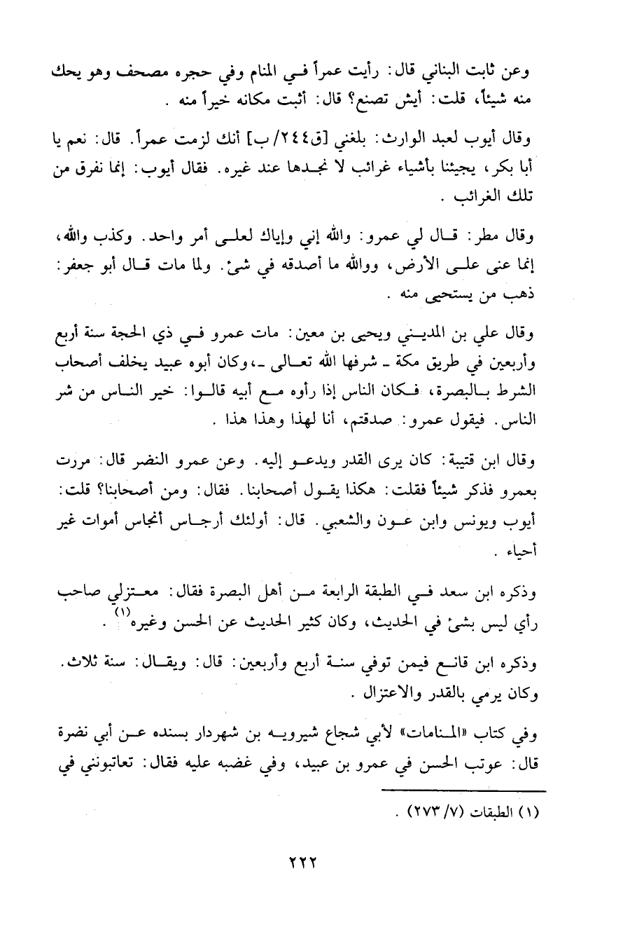 وفي كتاب " المنامات " لأبي شجاع شيرويه بن شهردار بسنده عن أبي نضرة قال: عوتب الحسن في عمرو بن عبيد، وفي غضبه عليه فقال: تعاتبونني في